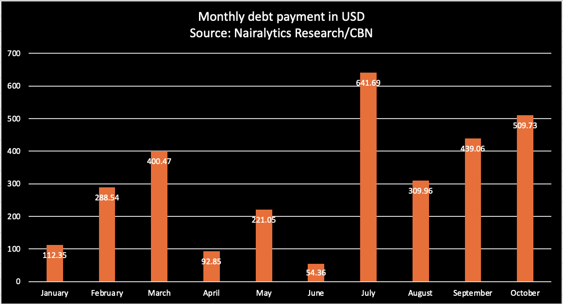 The CBN paid $112.35 million on external debt servicing in January; $288.54 million in February; $400.47 million in March; $92.85 million for April; $221.05 million in May; $54.36 million for June; $641.69 million in July; $309.96 million in August; $439.06 million in September and $509.73 million in October.